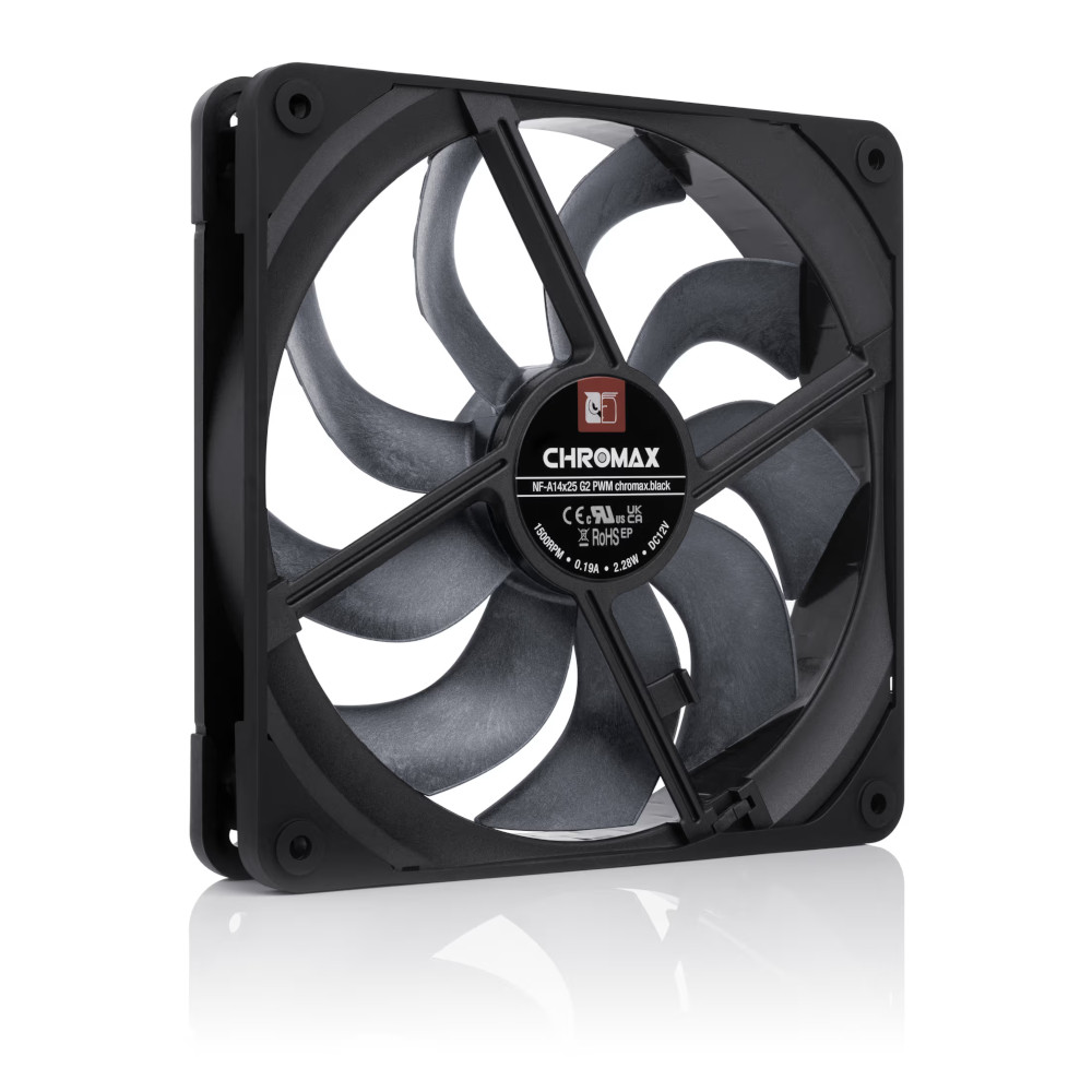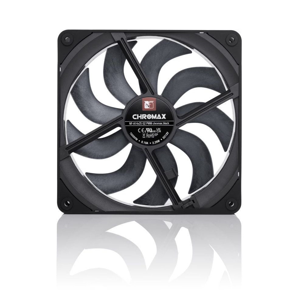 Topped off with Noctua’s trusted premium-grade SSO2 bearing, an MTTF of more than 150,000 hours and a 6-year manufacturer’s warranty, the NF-A14x25 G2 PWM chromax.black is the perfect choice for users who are looking for cutting-edge quality, quietness and performance in an all-black style.